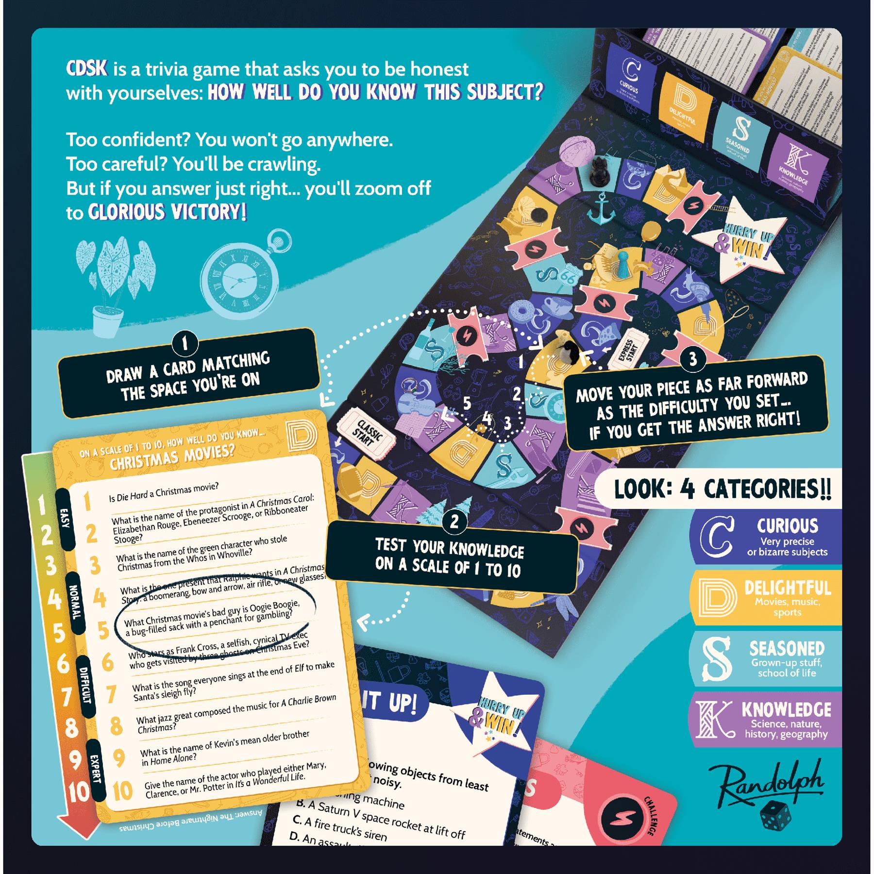 There is a question for everyone! Be honest with yourselves: how well do you know this subject? Too confident? You won’t go anywhere. Too careful? You’ll be crawling. But if you answer just right... you’ll zoom off to glorious victory! Pilot your team to victory by correctly determining your collective knowledge of various subjects on a scale of 1 to 10. How do you play? 1. Draw a card matching the space you’re on 2. Test your knowledge on a scale of 1 to 10 3. Move your piece as far forward as the difficulty you set... if you get the answer right! Goal: First team at the end of the board wins! SELLING POINTS More than 2500 questions divided in 4 themes: Curious, Delightful, Seasoned and Knowledge YOU set the bar! Even if you barely know a subject, you can still have a good answer! Good for small or large groups! THE PERFECT GAME For parties with families and friends! For every Trivia fan For Big groups in a party!