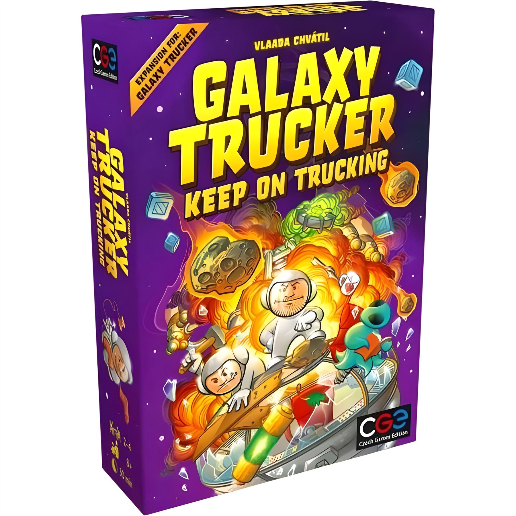 Keep on trucking with this new expansion for the relaunched version of Galaxy Trucker. With new ship classes, new adventure cards, more ship-building components, Rough Roads cards, and new aliens with unique abilities, your flight through the stars becomes more chaotic and more fun!