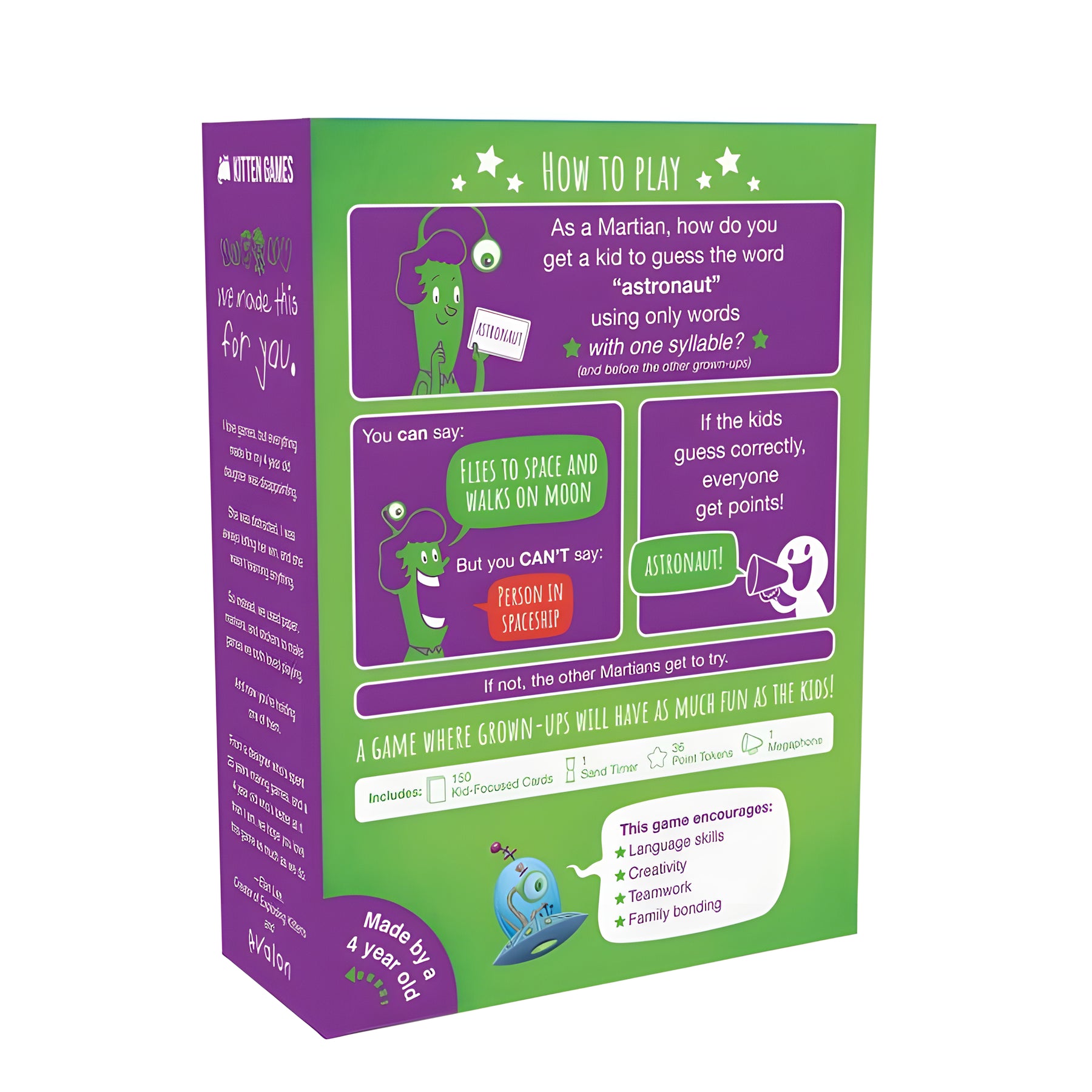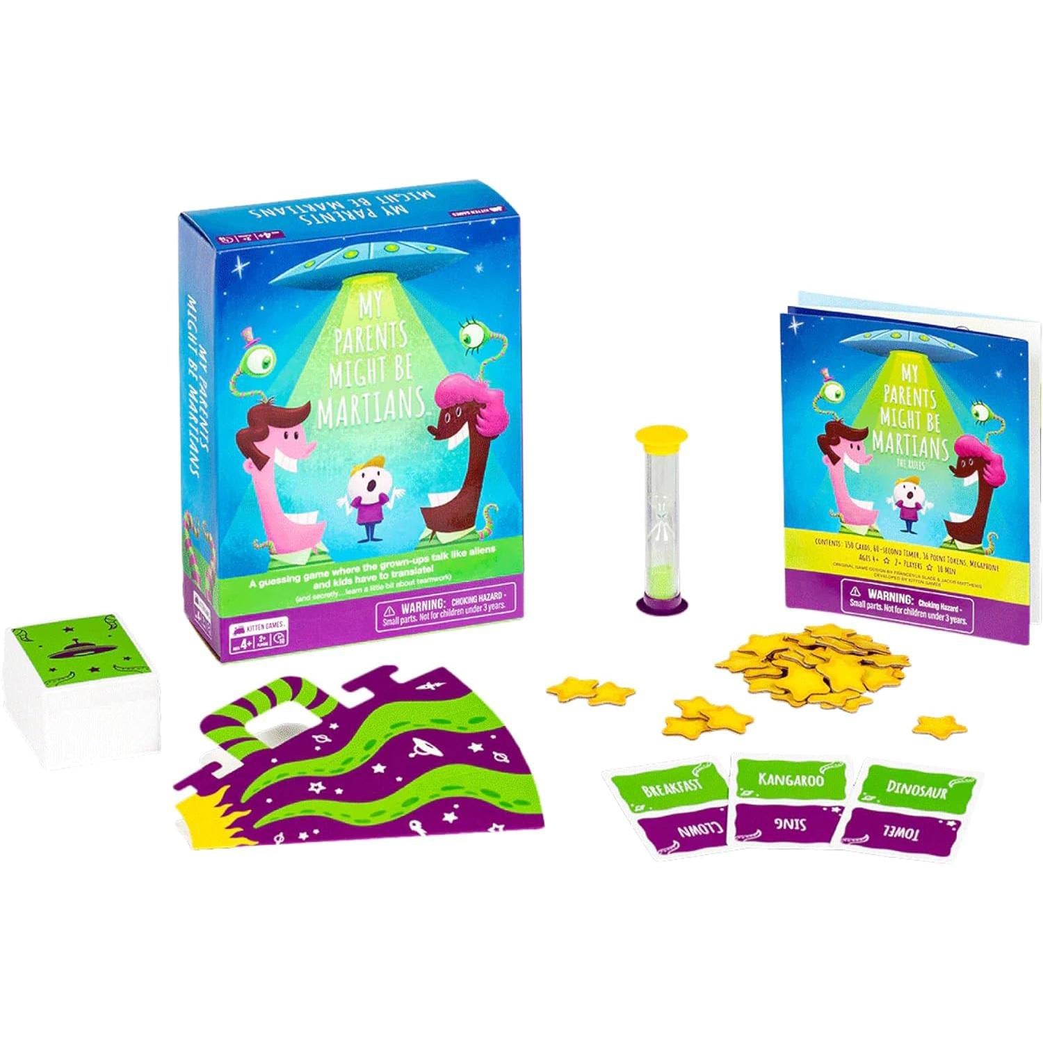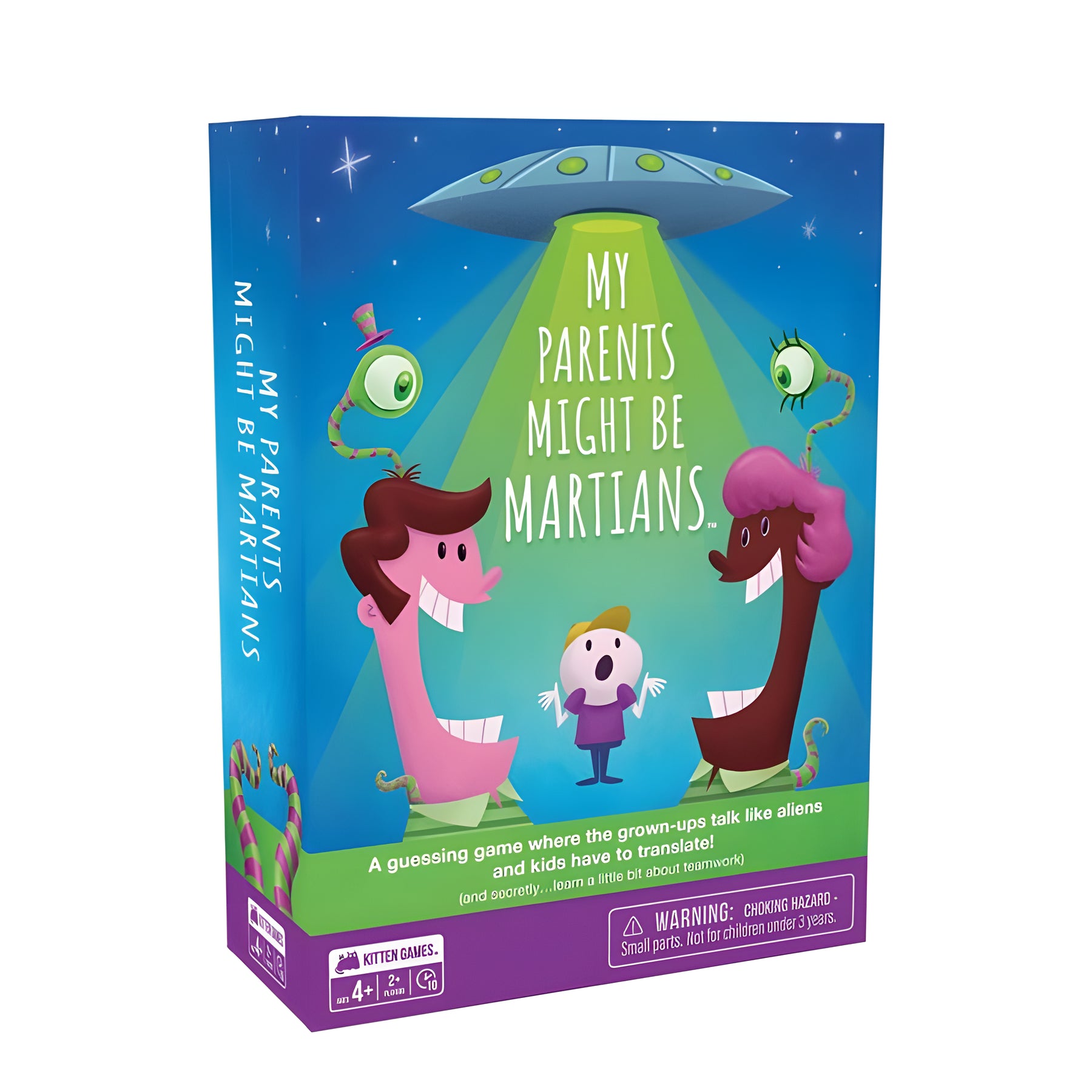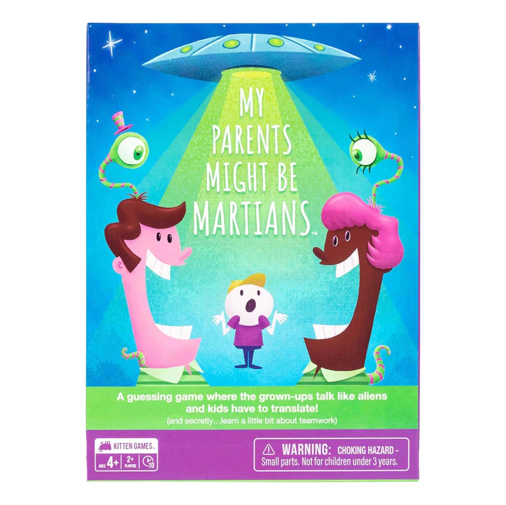 My Parents Might Be Martians plays like a junior version of Poetry for Neanderthals as adults must describe a hidden word to the kids' team using only one-syllable clues. Adults end up sounding like they're from another planet, while kids try to interpret the adults' clues and guess the correct words.