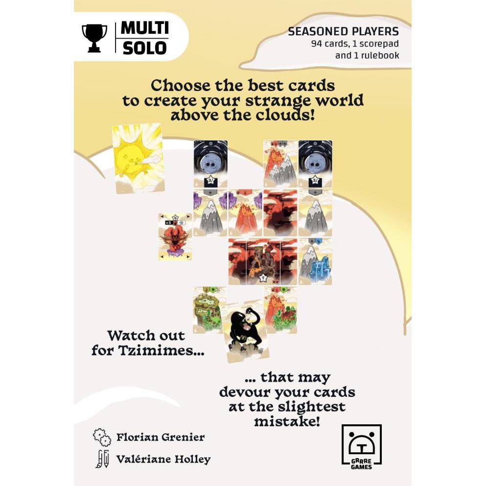 Create your own strange world above the clouds! Each person has a playing area in front of them. It's forbidden to play cards in an opponent's play area. Each turn, draw 3 cards, then lay your cards alternately, one at a time in your world, orthogonally adjacent to a card already laid in your playing area. Several types of terrain have laying constraints. In the event of non-compliance, the card played is placed face-down, with Tzimimes face-up, and yields no Stars at the end of the game. Other terrains have restrictive pose effects. Some cards add vertical and horizontal scoring. In Strange World Above the Clouds, you have to make the best of the worst. Indeed, with a very "tight" 3-card draft, your playing partners are bound to give you cards that are difficult to place in your playing area. But from this constrained optimization comes the pleasure of the game. Contents: 93 cards 1 score book 1 score booklet 1 rule