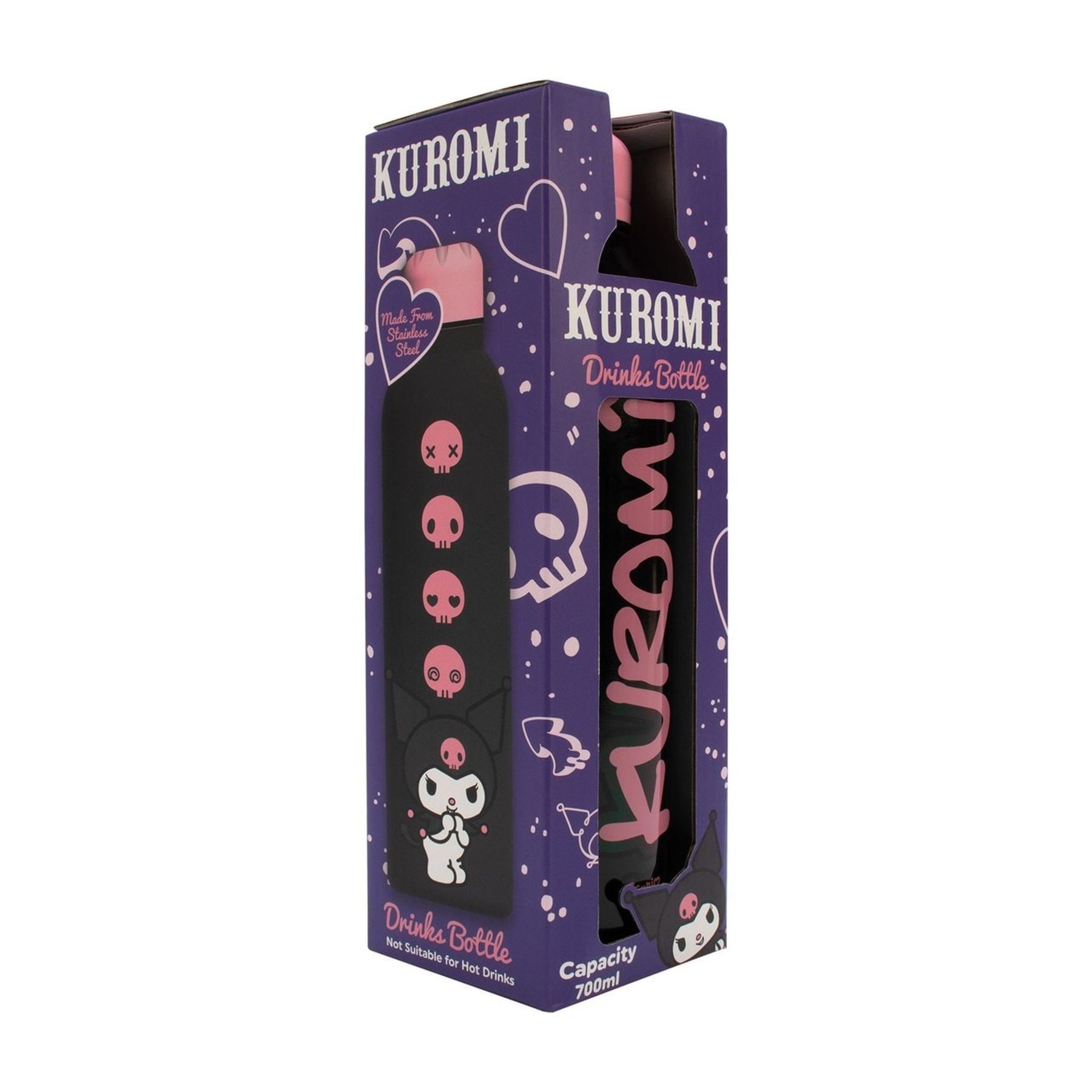 A 700ml stainless steel bottle adorned with Hello Kitty Kuromi artwork, this premium hydration accessory keeps your beverages at the ideal temperature while exuding playful, collectible charm.
