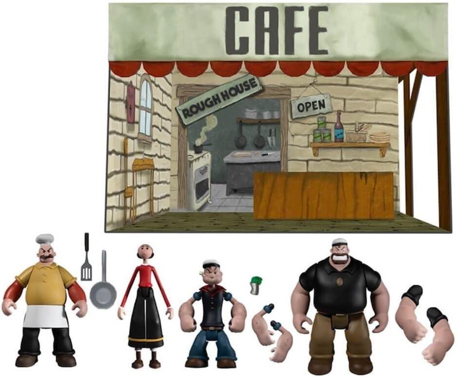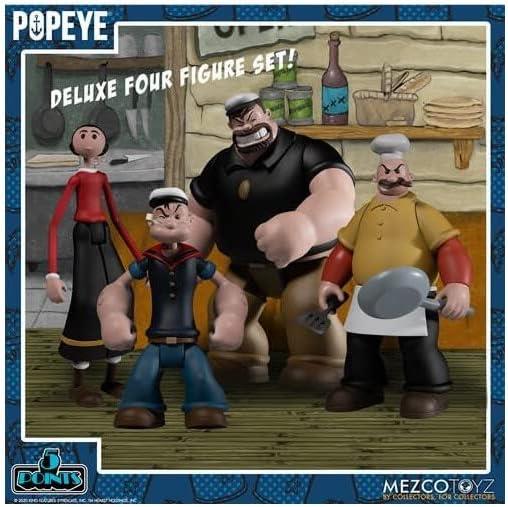 Ah ga ga ga! This titanic boxed set features Popeye, Olive Oyl, Bluto, Rough House, and a playset – talk about a whale of a time! Once assembled, Rough House’s Cafe features all the familiar details as seen in the nostalgic comic strips. THE 5 POINTS POPEYE: DELUXE BOXED SET INCLUDES: Popeye - Known for his constant muttering, squinting, and superhuman strength after gulping down a can of spinach, Popeye will do whatever it takes to rescue his beloved Olive Oyl from the wicked hands of Bluto. Popeye comes with a spinach can that he can hold and two pairs of interchangeable arms. Olive Oyl – the poster girl for “damsel in distress”, Olive Oyl is Popeye’s eternal sweetheart. The two have stuck together through thick and thin. Bluto – the brutish arch-rival of Popeye, Bluto is always trying to get rid of Popeye or strike it rich. Bluto has a devious attraction towards Olive Oyl and usually attempts to make her his conquest. Bluto comes with two pairs of interchangeable arms. Rough House – a hard working chef and owner of Rough House’s Café, offering hamburgers and advice to those in need. Rough House comes with a spatula and a frying pan that he can hold. Rough House’s Café – owned and operated by Rough House himself, this greasy spoon is the local hotspot for Popeye and his pals. ACCESSORIES: Two (2) pairs of interchangeable arms for Popeye Two (2) pairs of interchangeable arms for Bluto One (1) can of spinach One (1) spatula One (1) frying pan Four (4) display bases 5 Points are Mezco’s upgrade to the articulated action figures of yesteryear. These highly detailed, poseable action figures feature some of pop culture’s most familiar faces, both old and new.