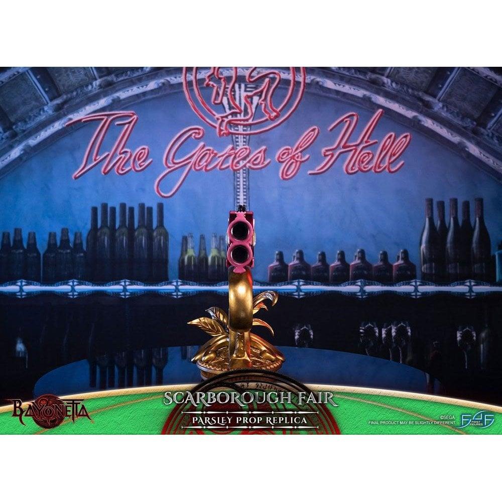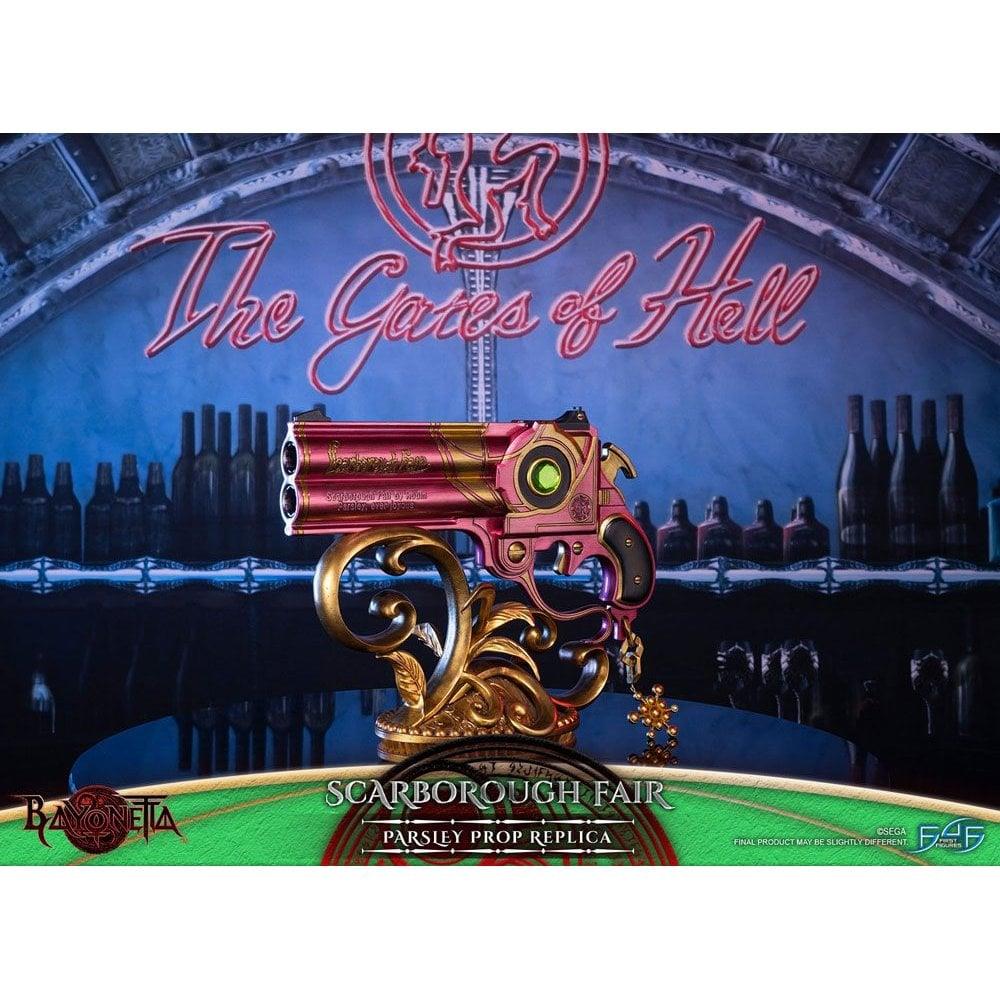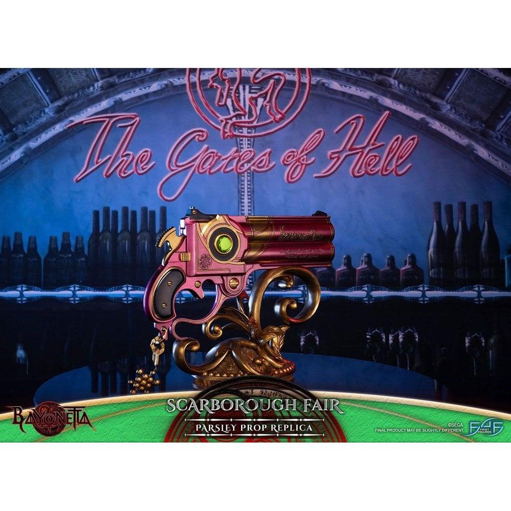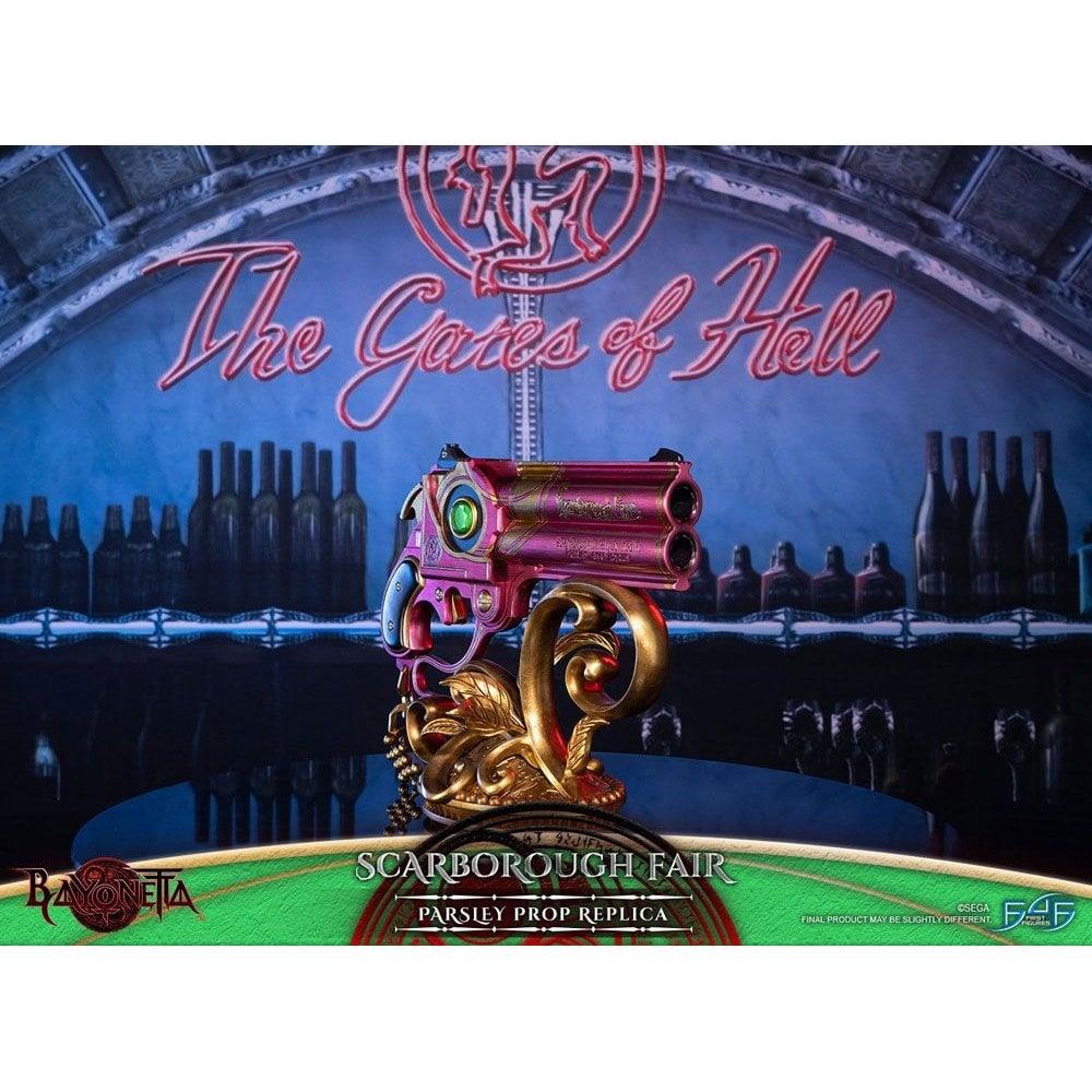 First 4 Figures is proud to introduce their latest collectible, the Scarborough Fair Prop Replicas! This is the first statue to release in the all-new Bayonetta Prop Replica lineup. "These babies are special. Built from an alloy the Devil himself would kill to get his hands on. Don't break these, 'cuz they're one of a kind." - RODIN, Bayonetta The Scarborough Fair is a set of four guns crafted by the famed demon-smith Rodin. The four, dubbed Parsley, Sage, Rosemary, and Thyme, are now wielded by Bayonetta after receiving it as a gift from Rodin. Each gun can easily be distinguished by the colored jewel on its sides: green for Parsley, pink for Sage, blue for Rosemary, and white for Thyme. Each gun also has a uniquely designed chain dangling by the gun's grip, which is made out of metal in this prop replica for a more realistic finish. Lastly, just like in the game, each gun has Rodin's copyright engraved on it-""Scarborough Fair by Rodin""-and underneath that the guns' name: ""Parsley, ever joyous""; ""Sage, ever strong""; ""Rosemary, ever reminiscent""; and ""Thyme, ever courageous""! The design of the base is inspired by the baroque style and décor of Rodin's bar, The Gates of Hell. The base was also given a metallic gold finish to complement the guns' gold details and metallic look! Bayonetta - Parsley Prop Replica (Standard Edition) comes with the following: Bayonetta - Parsley Prop Replica resin painted statue Highly detailed base inspired by the Bayonetta art style Limited edition numbering & Authentication card Product Size: approx. 32 x 14 x 26 cm