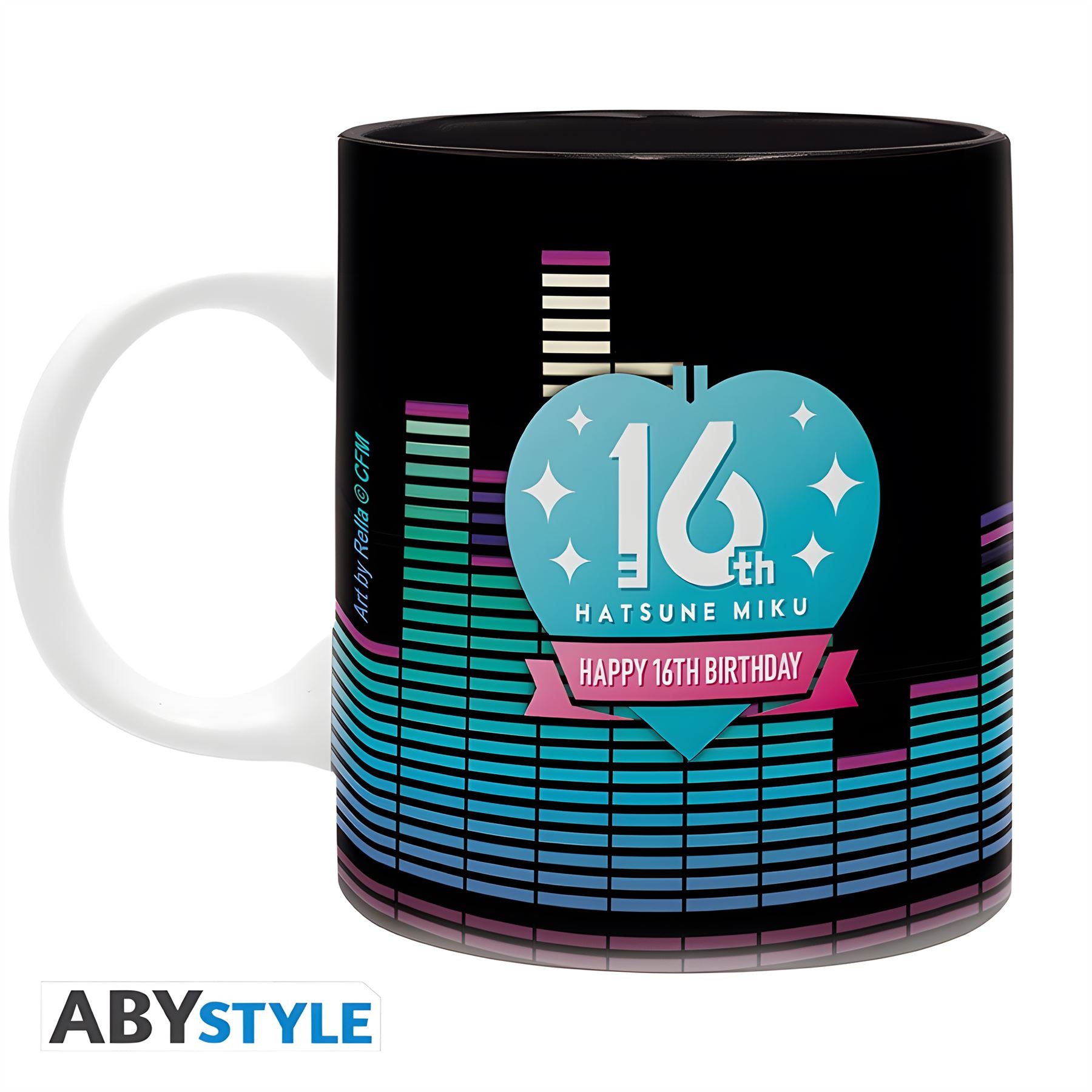 Start your day on the right wavelength by soaring through the soundbars with Hatsune Miku on her sweet 16th birthday! This 320ml ceramic mug by ABYstyle features exclusive art by Rella celebrating your favorite virtual singer's 16th birthday and anniversary. - Standard size (320ml) - Packaging: window-box. - Dishwasher and micro-wave safe.