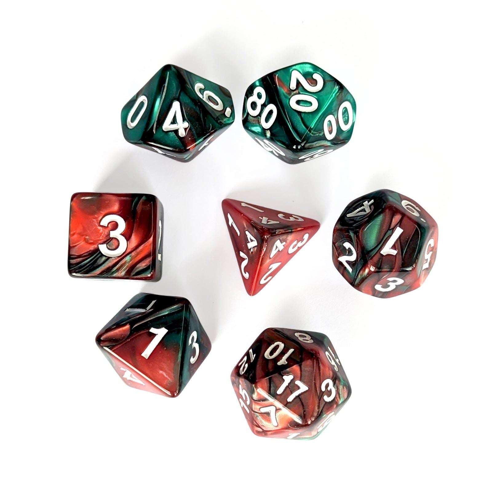 Mythic Loot - Duo Tone Green & Red / White Poly Set of 7 Dice