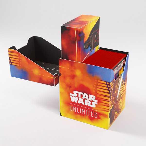 The all-in-one casual solution for Star Wars™: Unlimited players. This full color printed and officially licensed deck box is packed with ingenious features. It protects a full double-sleeved deck of cards and includes an innovative token box! This token box has a smart click-lock mechanism to keep all tokens safely stored – even while pulling it out. Once opened, the lid of the box stays upright for convenient access during gameplay.