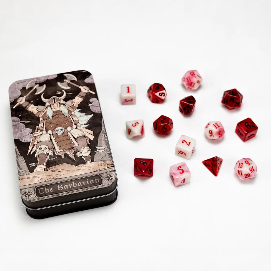 You are the barbarian. These are your dice. You are an ill-tempered outsider with a penchant for violence. To the barbarian, most problems have simple solutions—break it, kill it, eat it. Spells are for daintier hands; yours bear the calluses of heavy blades left in the skulls of gargantuan foes. Tear the lid off this tin and grab a fistful of 14 dice, including multiple d6s and d12s for doling out brutal criticals with greatswords and greataxes. THEY WON'T LIKE YOU WHEN YOU'RE ANGRY. Set includes: Red: D4, D6, D8, D10, D100, D12, D20 White: 3D6, D8, D12, 2D20