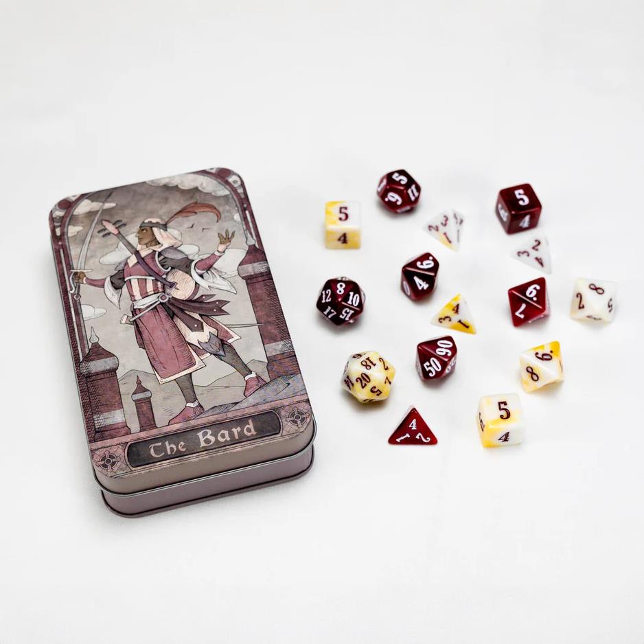 You are the bard. These are your dice. As a jack-of-all-trades you're ready for anything and never at a loss for words. With an incantation or enchanting lyric, you can deliver inspiration and vicious mockery in equal measure. Within this tin awaits 15 dice in two color designs. Roll them with your inimitable style to begin crafting the details of your NEXT EPIC SAGA! Set includes: Purple: D4, D6, D8, D10, D100, D12, D20 Yellow: 3D4, 2D6, 2D8, D20