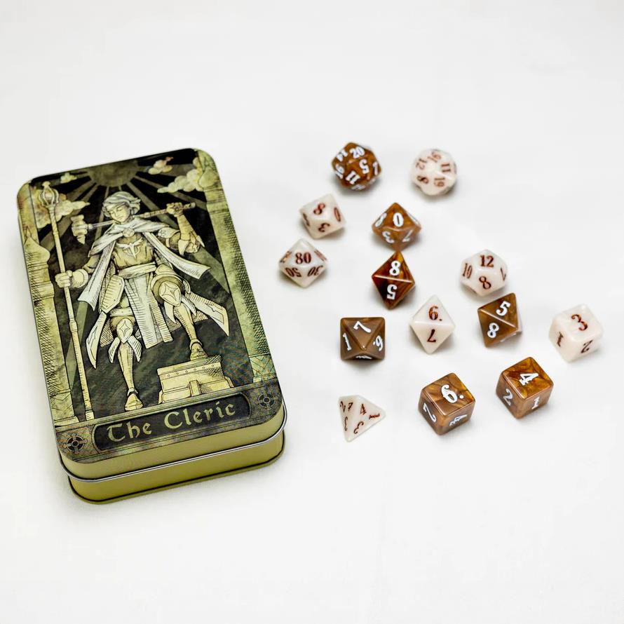 You are the cleric. These dice are yours. MAY THE GODS GIVE YOU COURAGE to face your enemies, the serenity to deal with the fighter's whinging, and the insight to keep the rogue from stealing all the loot. Unseal this relic to reveal 14 dice in two color designs, with four d8s for healing allies or dispatching enemies with your god's sacred flame. Set includes: White: D4, D6, D8, D10, D100, D12, D20 Gold: 2D6, 3D8, D10, D20
