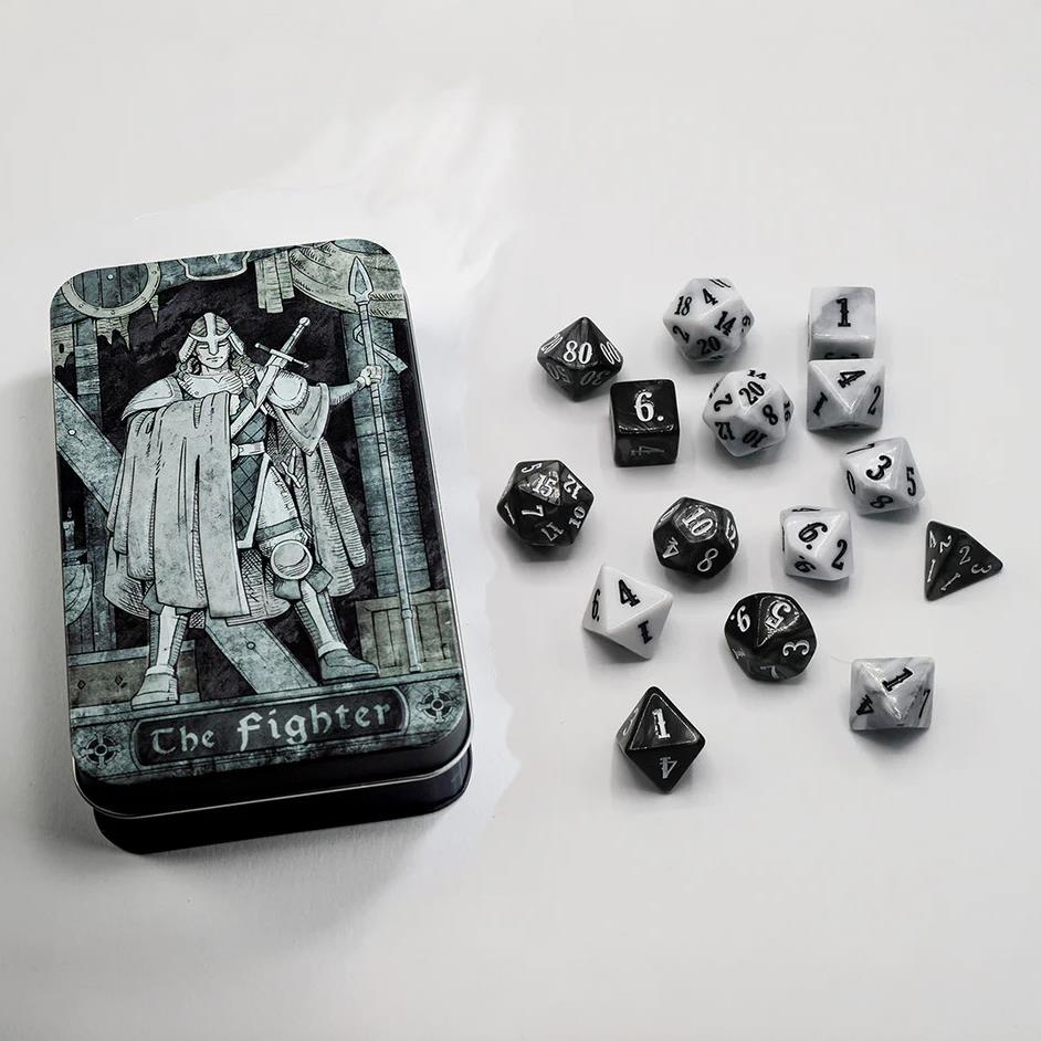 You are the fighter. These are your dice. You bring the pain. You're loud and hard to kill and never run from a foe unless everyone else runs first. You are the pointy end of the sword and have the beautiful scars to show for it. Open this tin and unleash 15 dice in two color designs, including extra d8s and d10s for battle superiority. Not to mention the two extra d20s to attack at advantage and VANQUISH YOUR FOES WITH VIGOR! Set includes: Silver: D4, D6, D8, D10, D100, D12, D20 White: D6, 3D8, 2D10, 2D20