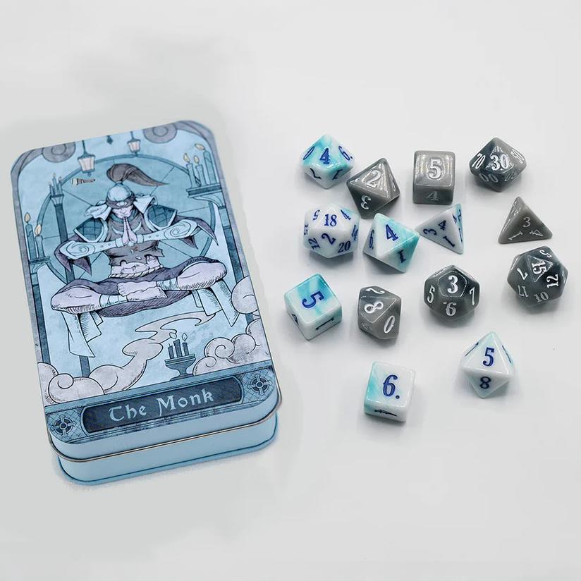 You are the monk. These are your dice. You've honed your body and mind into the purest of weapons. KI FLOWS THROUGH YOU. Harness it. Channel it. Release it. Liberate the 14 dice in two color designs that have been bound within this tin. Whatever martial arts damage you're dishing out on your opponents, you're covered with this set. Set includes: Dark Blue: D4, D6, D8, D10, D100, D12, D20 Light Blue: D4, 2D6, 2D8, D10, D20
