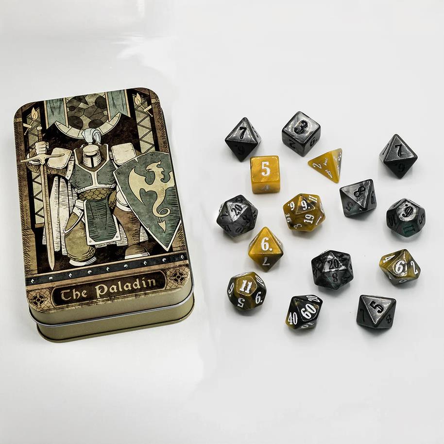 You are the paladin. These are your dice. You are sworn to your cause, and the holy power of your righteousness flows through your every action. Let the others dither and debate; you will deliver swift justice on the field of battle. Open this tin and unleash 15 dice in two color designs, with d8s for smiting and an extra d6 and d12 for the weapon damage from your mighty blades. Set includes: Gold: D4, D6, D8, D10, D100, D12, D20 Silver: D6, 4D8, D12, 2D20