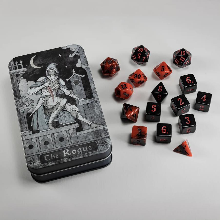 You are the rogue. These are your dice. A rogue's journey is not all backstabbing, searching for traps, and picking locks. There's also staying out of the line of fire and making sure you're first to the loot. But WHEN THERE'S STABBING TO BE DONE you'll need these dice. Pick the lock on this tin to reveal 16 dice in two color design, with tons of d6s for the stabbing, as well as extra d20s for scurrying about in the shadows and the advantage rolls that it brings. Set includes: Red: D4, D6, D8, D10, D100, D12, D20 Black: 6D6, D8, 2D20