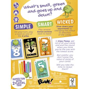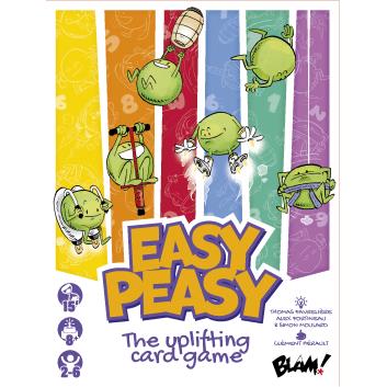 In Easy Peasy, get rid of your cards and end the round when you think you have the lowest score... But be careful, you don't know all your cards! Will you take the time to reveal them? On your turn, play your cards on one of the 2 discard piles, respecting the direction set by the Up&Down card: either go up in value, or go down. Don't hesitate to change this direction to gain an advantage and slow down your opponents! Anticipate your actions to get rid of the cards you have in your hand or in front of you at the right moment (some of which are hidden at the start) to end the round and score as few points as possible! After 3 rounds, the player with the lowest score wins the game. Get ready to get hooked on Easy Peasy, it's so clever and fast! Designed for 2 to 6 players, it shines in all configurations.