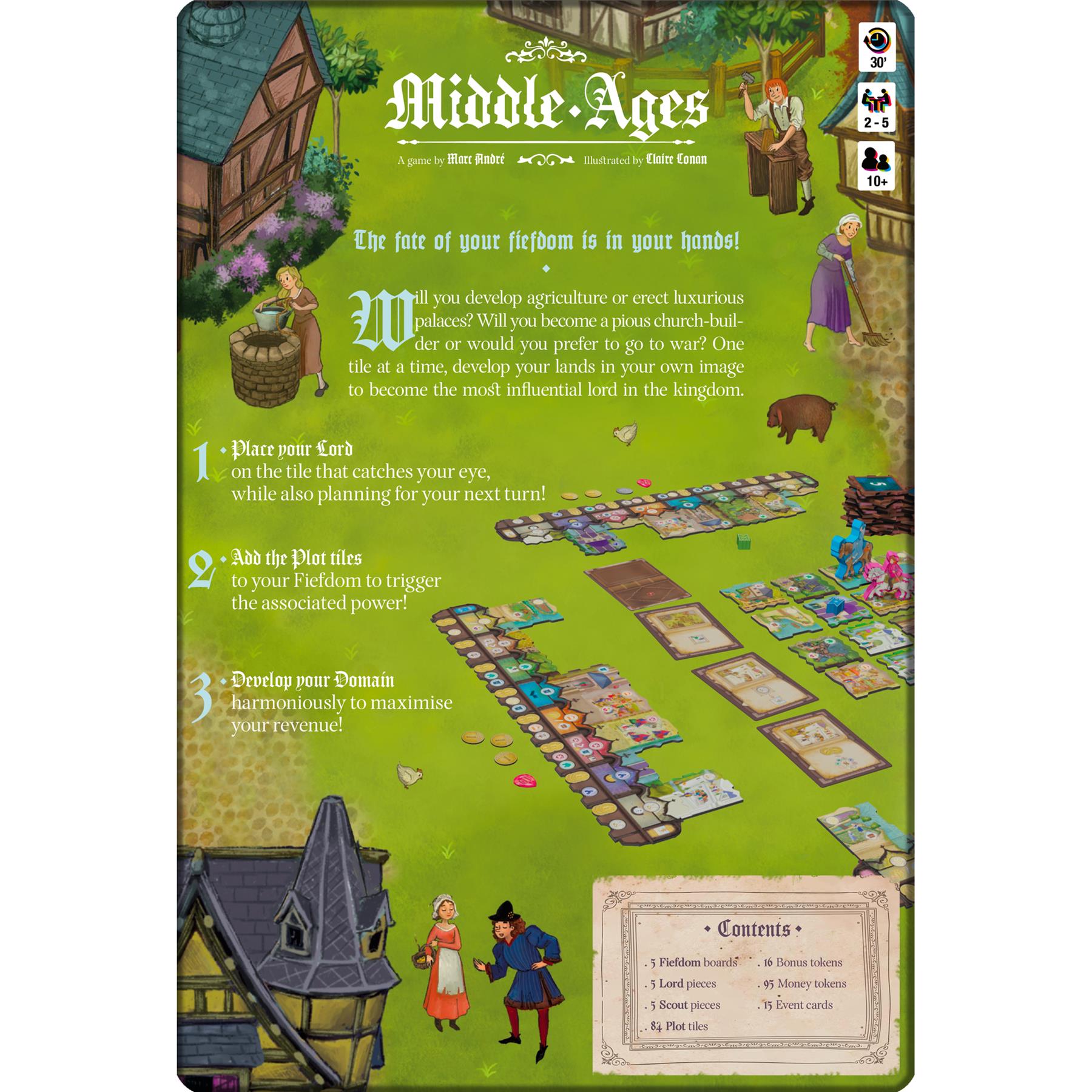 In Middle Ages, you are the head of a fiefdom and the future lies in your hands. Choose your path wisely, whether you focus on agriculture, faith, or luxury, and shape your realm according to your vision. Explore the essence of medieval urban life through 8 distinct tiles: fields, farms, villages, forts, markets, barracks, churches, and palaces. Each tile features its own scoring system yet linked to others, offering a rich and immersive gaming experience. Unleash strategic maneuvers, from daring assaults on rival fiefdoms to reserving tiles for future use. Harness the power of tactical combinations to amplify your income and pave your way to triumph! Includes screenprinted wooden player pieces Every tile features unique art Build your fiefdom and create a money-making engine From the designer of Splendor! Marc André