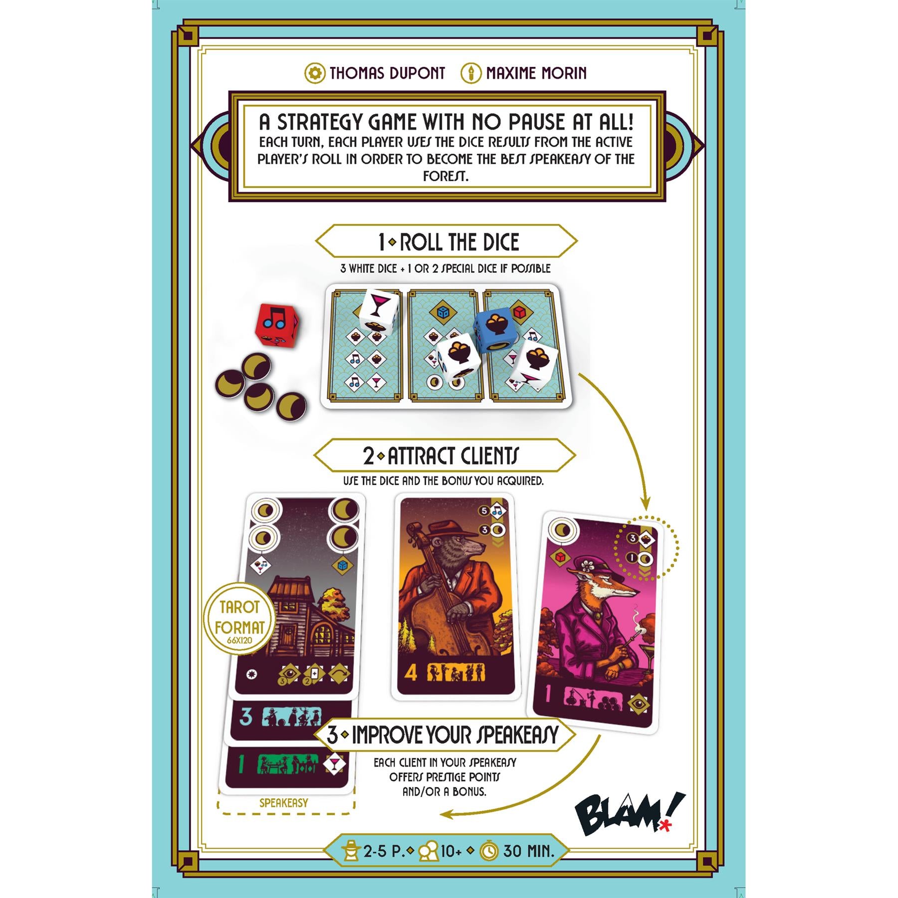 Grow your speakeasy in the shadow of Prohibition Moonshine is a dice-based engine-building game in which players play simultaneously. On each turn, each player exploits the dice results obtained by the active player for their own purposes, in order to enhance the appeal of their speakeasy. The aim of the game is to attract enough customers to reach 12 prestige points. When a player achieves this, the game ends and the player with the highest score wins. A game consists of a succession of rounds, all of which take place in the same way: first, the active player rolls - and possibly re-rolls - all the dice to which he has access, to validate a pool of dice. Each player then disposes of the resulting icons as they see fit. These icons represent prohibited resources prized by potential customers (each player has their own potential customers). By satisfying a customer's specific needs, they enters the bar and benefits from the permanent bonus: prestige points, resource icons, access to other dice (blue and red dice), to raises, to other potential customers, etc. If ever a player doesn't want to or can't exploit the dice result, they is not stuck! They can either pick up a Moon token to place on one of their cards to unlock a temporary bonus; or replace one of their potential customers with a new one. The game also includes an asymmetric start variant: each speakeasy has completely different abilities and temporary bonuses!